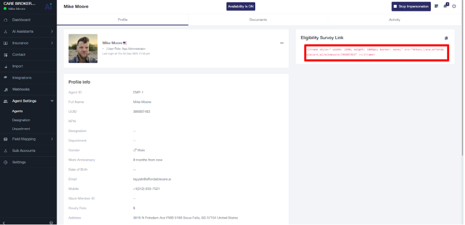 - Go to the settings in your agent portal and copy the ACA Flow link.