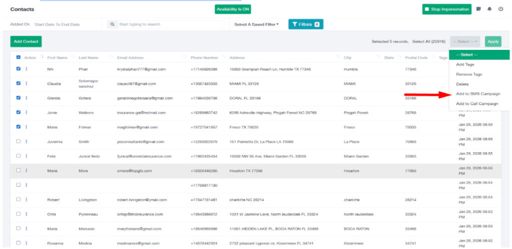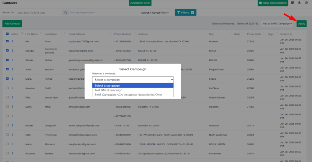 - Select the SMS Campaign you want to enroll these contacts into.