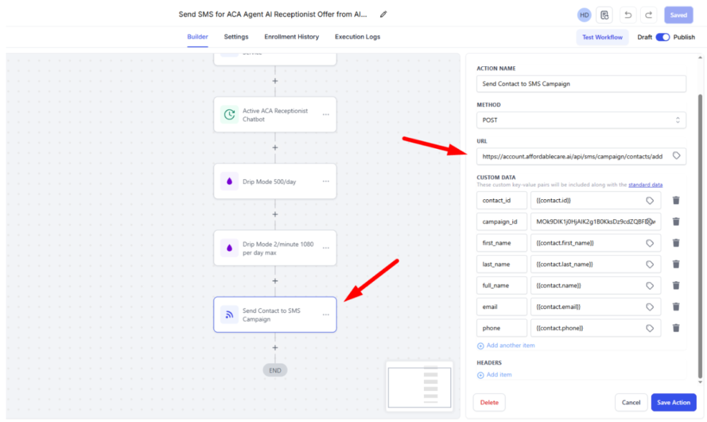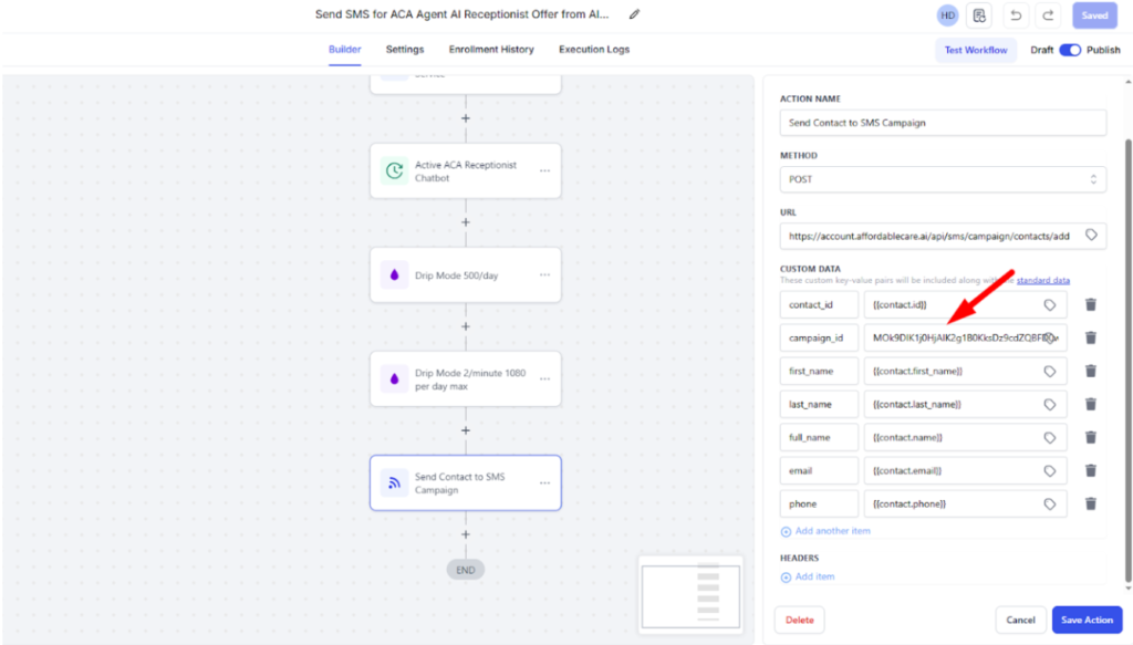 Once the workflow runs, leads from GoHighLevel will be automatically enrolled into the selected SMS campaign.
