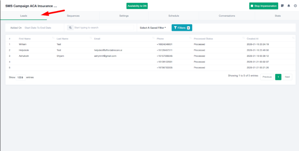 - It displays all contacts/leads enrolled in this SMS campaign.