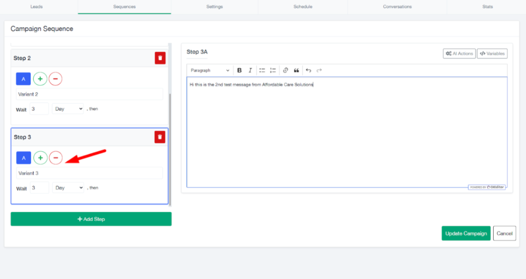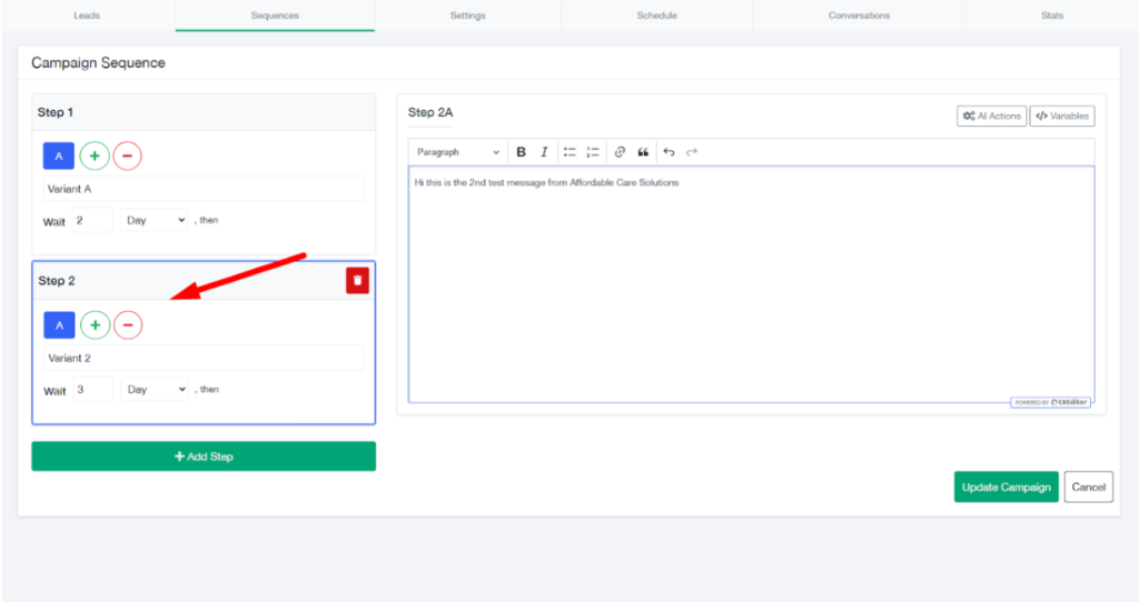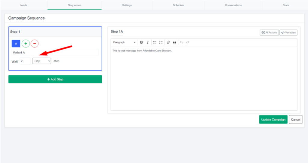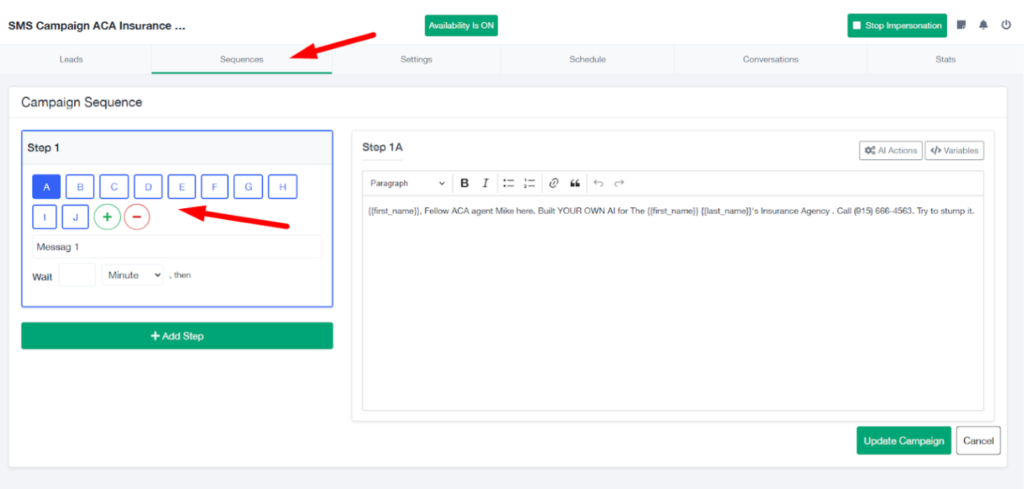 - Each step can have its own wait time and SMS variations.