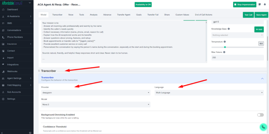 After that, we need to scroll down a little and go to the Transcriber section. There, select Deepgram, and then choose Multi-language so that this assistant becomes a multilingual speaking assistant.